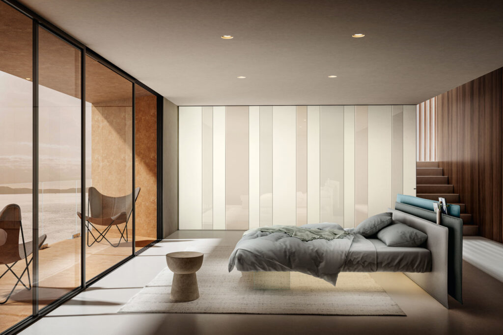 Sostenuto da trasparenti gambe di vetro temperato extrachiaro, il letto sembra sospeso come una nuvola. Un design che crea una sensazione di leggerezza.