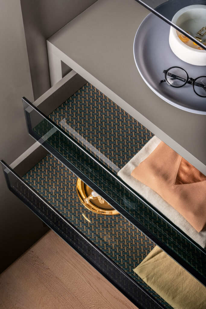 Le raffinate texture XGLASS dei ripiani e delle cassettiere possono essere abbinate ai frontali creando un prodotto ricercato e armonioso tanto all’esterno quanto al suo interno.
