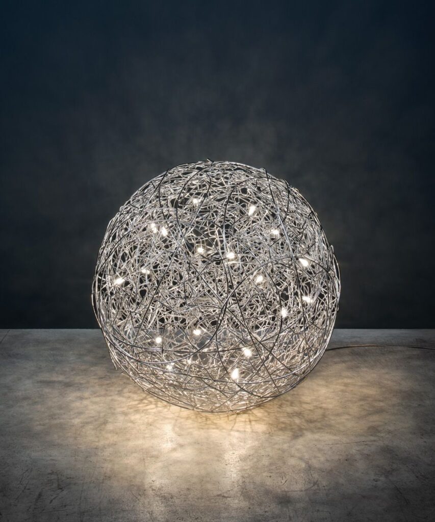 La lampada da terra Fil de Fer di Cattelani e Smith con il suo intreccio di fili e piccole lampadine LED, posta in angoli strategici della casa, trasmette un’atmosfera magica, quasi poetica nella sua raffinatezza.