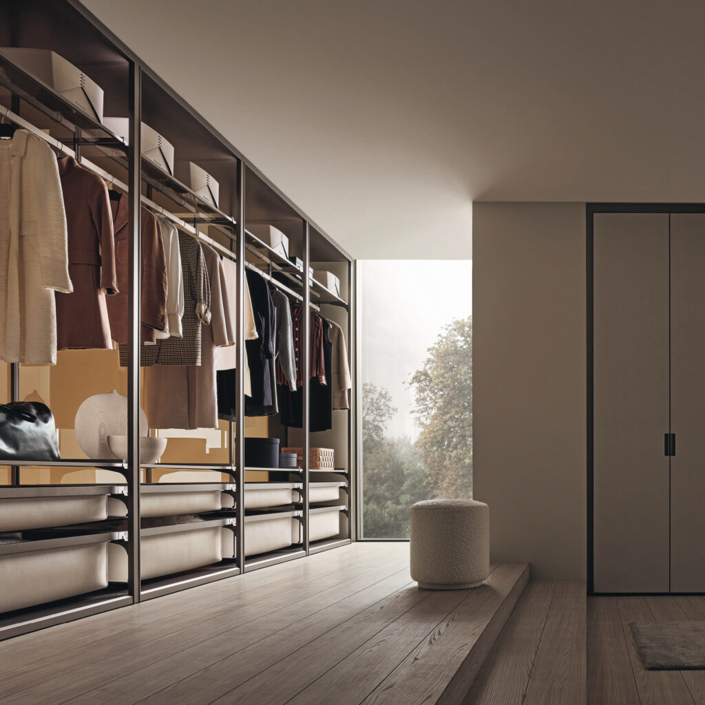 I profili frontali in alluminio esaltano gli elementi dell’armadio, in particolare la struttura, realizzata in bronzo con ripiani e fianchi in vetro, declinati nelle versioni bronzo trasparente e acidato.