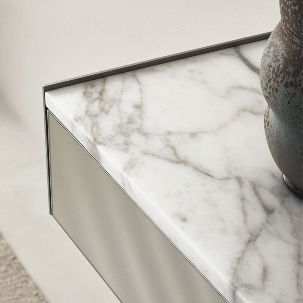 Ideali sia per arredi domestici che contract, si abbinano perfettamente alla mensola Self Bold, una madia sospesa il cui elegante piano è realizzato in finitura platino e raffinato marmo Calacatta.